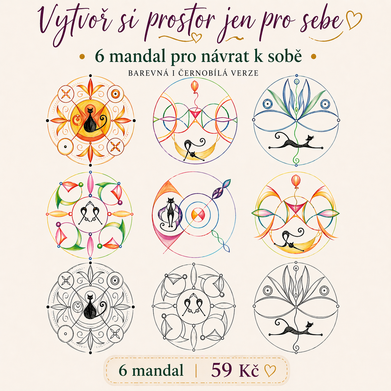 Tato sada obsahuje výběr 6 mandal z mé již hotové tvorby na téma "kočičí vlastnosti".